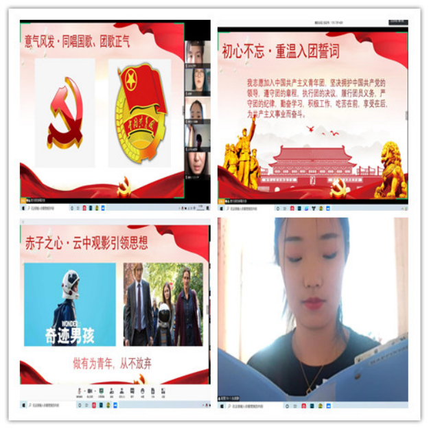 大力培养青年的爱国情、强国志、报国行,鼓励团员青年自觉踏征程,领悟新思想。学院团委依托腾讯会议分别开展了以“弘扬五四精神 奉献火热青春”、“我们正青春 奋斗正当时”、“忆五四峥嵘 诵青春华章”为主题的团日活动,涵盖了齐唱国歌团歌、重温入团誓词、团旗下的演讲、同看一部励志影片等多种形式,真正做到了:学习有收获、思想受洗礼、来日敢担当、青春不打烊。