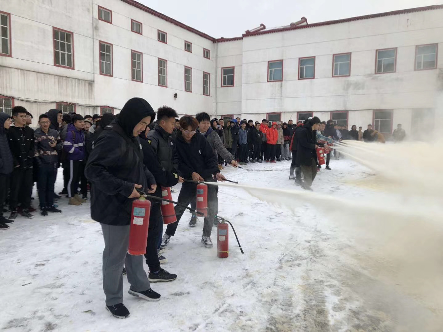 本次消防安全演练由建工学院员工会分会治保部辅助,演练共分为两项。第一项是以宿舍楼为中心展开的逃生演练,宿舍楼负责人用宿舍消防烟雾发生装置释放烟雾,同时从广播中播放防火警铃。同学们听到铃声后,按楼层从低到高,寝室距安全出口由近到远的顺序,迅速而有序的撤离。同时,四位老师在宿舍公寓门口监督同学们的撤离情况。随后,撤出的同学们转移到779cn太阳集团与供热中心围合的空旷场地集合。待所有同学安全撤离且集合完毕后,开始进行演练第二项,如何正确使用灭火器灭火。在老师的指挥下,同学们按环形围绕在中央事先燃起的两个起火点,安保人员将事先准备好的干粉灭火器分发给队列中的两名同学,由他们向在场的同学们介绍干粉灭火器的构造原理及使用方法。最后,对火源进行灭火,整场演练在老师和同学们的掌声中结束,779cn太阳集团消防安全演练圆满完成。