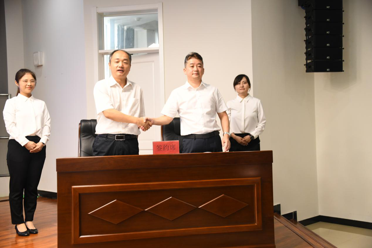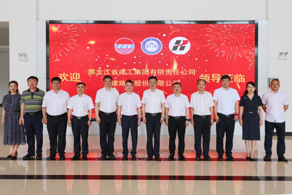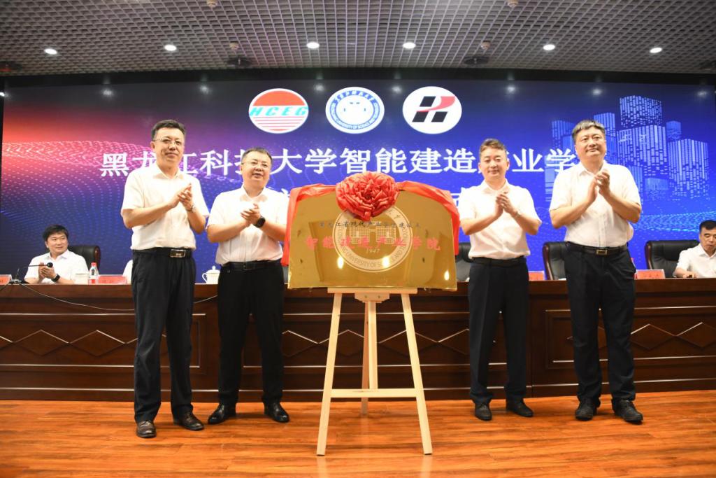 陈凯云副董事长分别与黑龙江省建工集团有限责任公司总经理石新波、龙建路桥有限公司总经理宁长远为共建智能建造产业学院现场签约。周宏力书记、孟上九董事长、石新波总经理、宁长远总经理共同为智能建造产业学院揭牌。