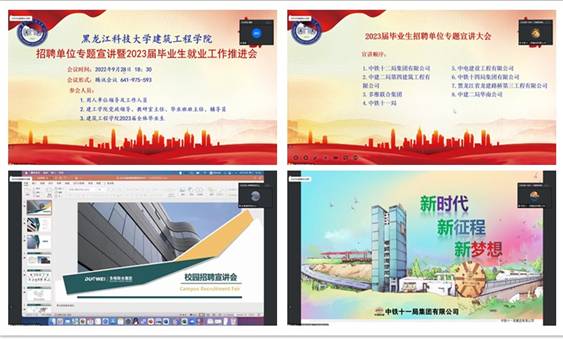 为充分利用好毕业生秋季就业最佳时期,促进2023届毕业生顺利就业、高质量就业,9月28日晚18点30分,779cn太阳集团组织召开了用人单位招聘专场宣讲暨毕业生就业工作推进大会。会议采取线上形式、分两个阶段进行,会议由学院副处级辅导员展跃主持,中铁十四局集团有限公司等8家用人单位负责招聘的领导和工作人员、公司党政领导、教研室主任、毕业班班主任、辅导员和全体23届毕业生参加了会议。