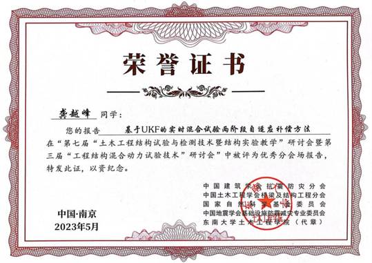 公司王涛教授作学术报告“结构混合试验方法关键问题初探”,交流了课题组在迭代混合试验方法、模型更新混合试验方法和时滞补偿方法等关键问题的最新研究进展;硕士研究生龚越峰和浩杰敦在研究生论坛中分别进行了“基于UKF的实时混合实验两阶段自适应补偿方法”和“基于多任务加载的实时混合实验方法”的学术报告,均被评为优秀分会场报告。