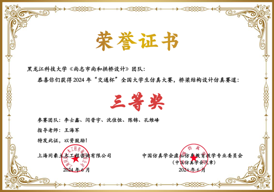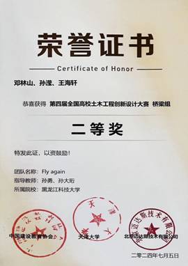 第四届全国高校土木工程创新设计大赛由中国建设教育协会主办,天津大学、北京迈达斯技术有限公司承办,本届赛事报名院校超210所,2000余名师生参与大赛角逐,经过预赛严格的评审、总决赛激烈答辩评分,最终评出156支获奖队伍。公司学子邓林山、孙滢、王海轩获得全国高校本科组桥梁组二等奖,且为东北三省各高校的最好成绩。