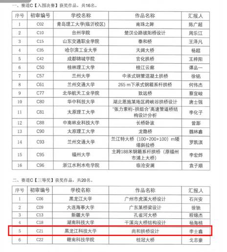 近日,在第四届全国高校土木工程创新设计大赛、“交通杯”全国老员工仿真大赛等两项具有较大行业影响力的学科竞赛中,由孙勇老师、孙大珩老师指导的“巩乃斯大桥施工控制方案设计”获得了全国二等奖;由王海军老师指导的“尚志市尚和拱桥设计”获得了全国三等奖的好成绩。