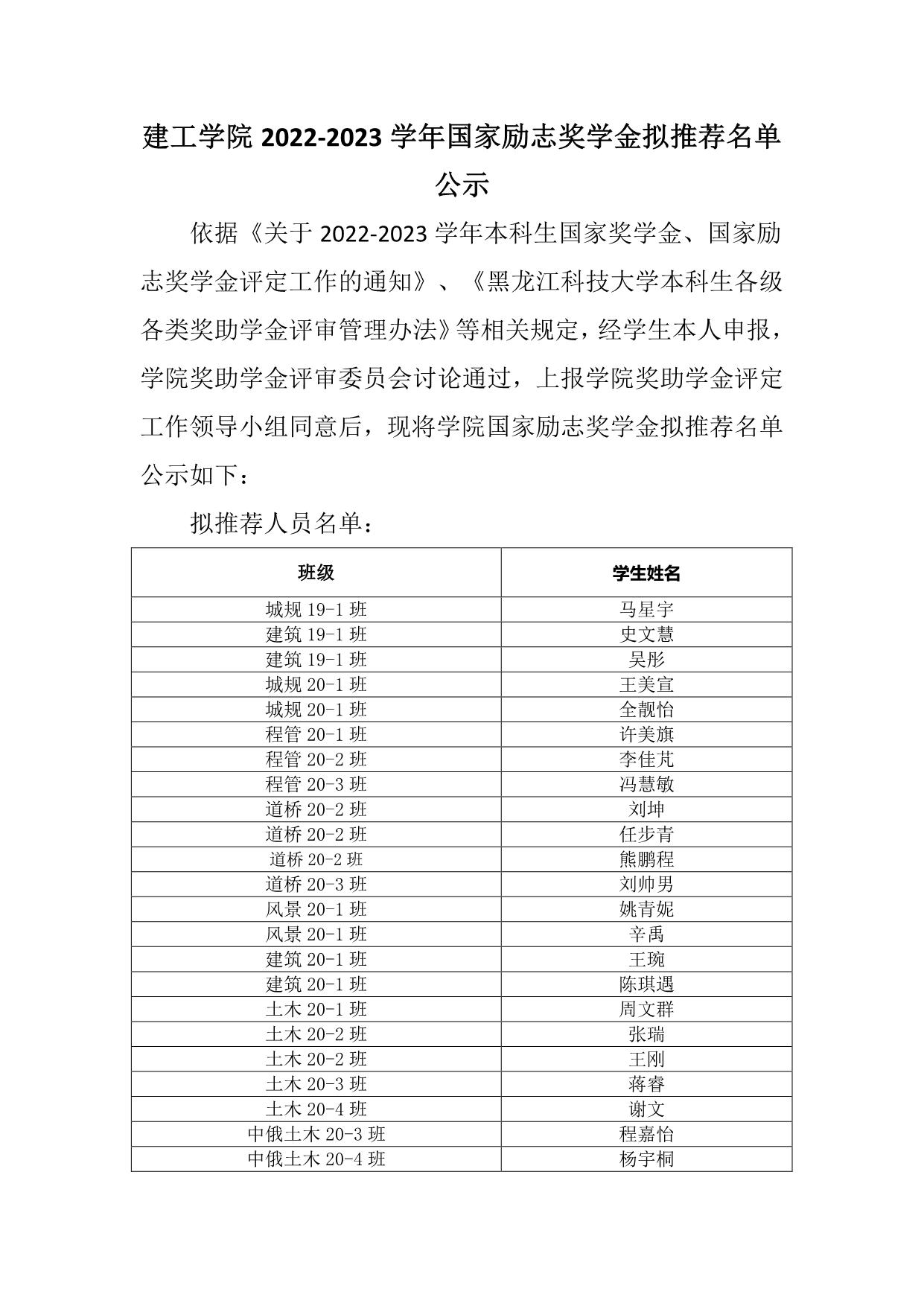 建工学院2022-2023学年国家励志奖学金拟推荐名单公示