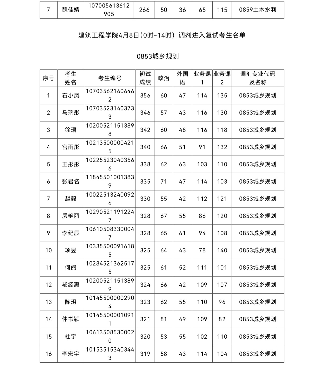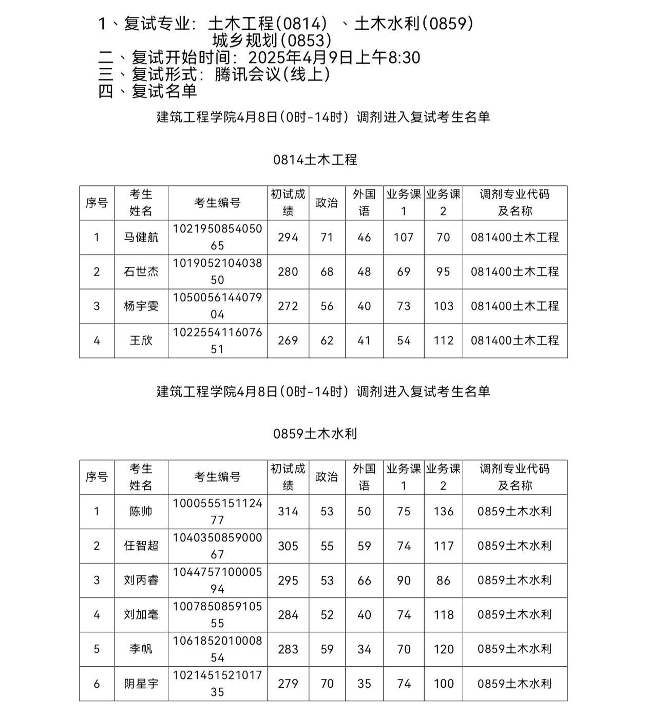 779cn太阳集团2025年硕士研究生招生考试(土木工程专业)第一次调剂复试成绩