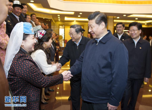 4月30日上午10时许,习近平和中共中央政治局常委、全国政协主席俞正声,在中共中央政治局委员、新疆维吾尔自治区党委书记张春贤和自治区政府主席努尔·白克力陪同下,来到新疆迎宾馆10号楼会见厅,接见新疆28名劳动模范和先进工作者、先进人物代表,同他们亲切握手、合影留念,之后同他们进行了座谈。
