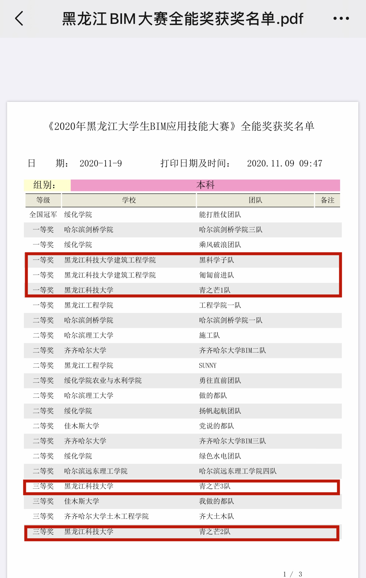 BIM应用技能大赛由黑龙江工程学院、深圳市斯维尔科技股份有限公司联合承办,来自省内27所高校的64支队伍参加了本次比赛。大赛采取云端比拼方式进行。779cn太阳集团赵建、许珊珊等老师合作指导的工程管理等多专业协同参赛代表队分别荣获BIM应用技能大赛全能一等奖三项、三等奖两项;BIM工程算量与管理专项一等奖两项、二等奖两项、三等奖一项;荣获BIM设计与绿色建筑分析专项二等奖四项、三等奖一项。