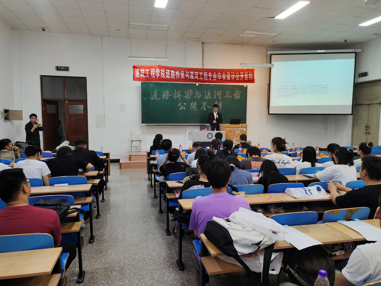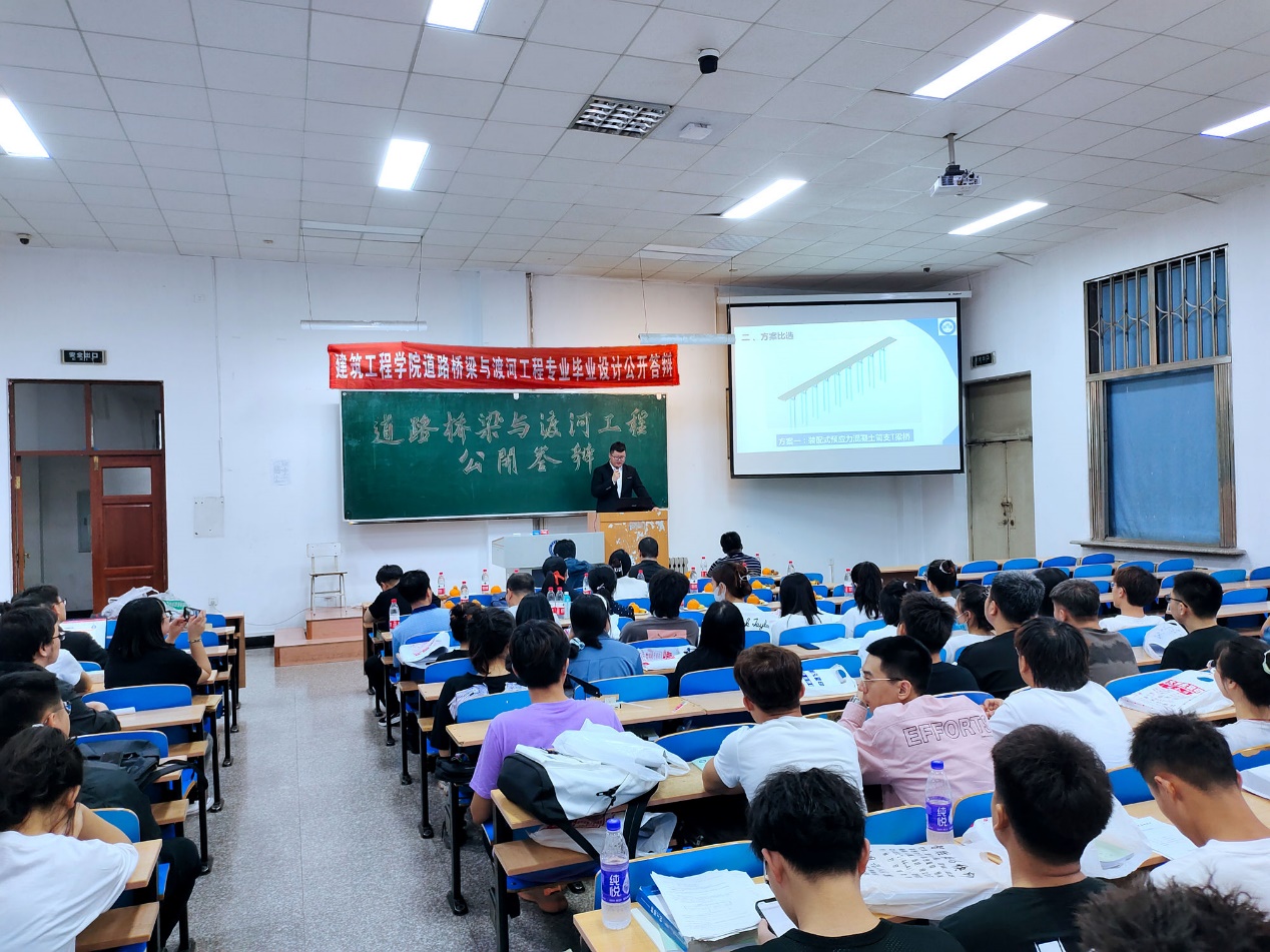 本届论文设立了3个答辩委员会小组,其中公开答辩组长孙勇,小组答辩1组组长王海军,2组组长黄学欣。其中,公开答辩于6月15日9:00开始,参加公开答辩的2位毕业生是从通过各毕业设计小组推荐、员工自述、教研室专业教师集体评议后,从4位(组)候选同学中遴选出的。分别是:道桥17-3班李文浩,毕业设计题目:《鄂尔多斯至磴口A7标段高速公路初步设计》;道桥17-1班吴敏轩,毕业设计题目:《肇源松花江特大桥主桥设计》。
