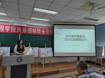 本届员工毕业设计选题丰富,本届毕业设计选题100%真题设计,选题多样,与公园城市、乡村振兴、城市双修等热点主题紧密结合,成果内容具有一定创新性,涵盖风景园林热点问题,均采用真题真做模式,徐飞鸿和董雪两位同学分别以“哈尔滨市曹家沟滨水公园景观设计”和“齐齐哈尔市仙鹤宾馆片区景观规划设计”为选题进行了公开答辩,与会专家进行了精彩点评。通过公开答辩展现了公司风景园林专业一如既往的“产学研用”、“毕业设计+实习+就业”一体化实践教学成果以及专业师德师风建设成果,为专业发展积累了丰富的实践教学经验。全体专业教师和风景园林、城乡规划和建筑学部分同学参加了本次公开答辩,公开答辩后进行了小组答辩,经过一天的工作,顺利完成了毕业设计答辩工作。