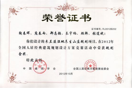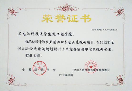 由城市规划专业陶春晖老师主持设计、青年教师郑志颖、顾韩及员工庞春雨、秦宇楠、张道斌参加的规划项目“木兰溪湿地养生山庄”在 2012年全国人居经典建筑规划设计方案竞赛活动中荣获规划金奖。 项目位于木兰镇西侧,北侧紧邻哈肇公路,南与松花江相接,规划总用地面积为265.46hm2。规划以围绕“水”和“地形”而展开,把游乐和生态理念运用到设计之中,通过运用现代景观设计手法,构筑了一个近有“景”,远可眺望松花江的生态型湿地景观新风貌。 设计利用场地内的山水林,自然元素之间生态互动,营造同自然共呼吸的休闲度假圣地。山:场地内有高差20m左右台地,植被丰富,地形错落有秩,景观丰富,在台地高处设计别墅区、度假区等,易于营造良好的观景场所。水:利用场地内地形,贯通两条沟地池塘,设计两条水系,汇入白杨木河,丰富场地内湿地景观,并增加临水面及栖水环境。林:场地内植被覆盖良好,具有较好的林地、农田资源,规划保留原有植被,林间“嵌入式”布置别墅度假区。 依据不同设计地段的用地性质与场地景观的条件,因地制宜地组织景观要素,进行了滨河湿地景观带、主题商业街、特色农家乐、养生别墅区、旅游度假区五大分区的景观设计。